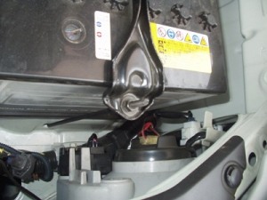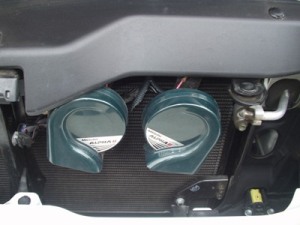 先ずバッテリーの主電源ケーブルを外します。純正のホーンはボンネットを開けると、すぐに見つかりました。フロントグリルのところにくっついています。